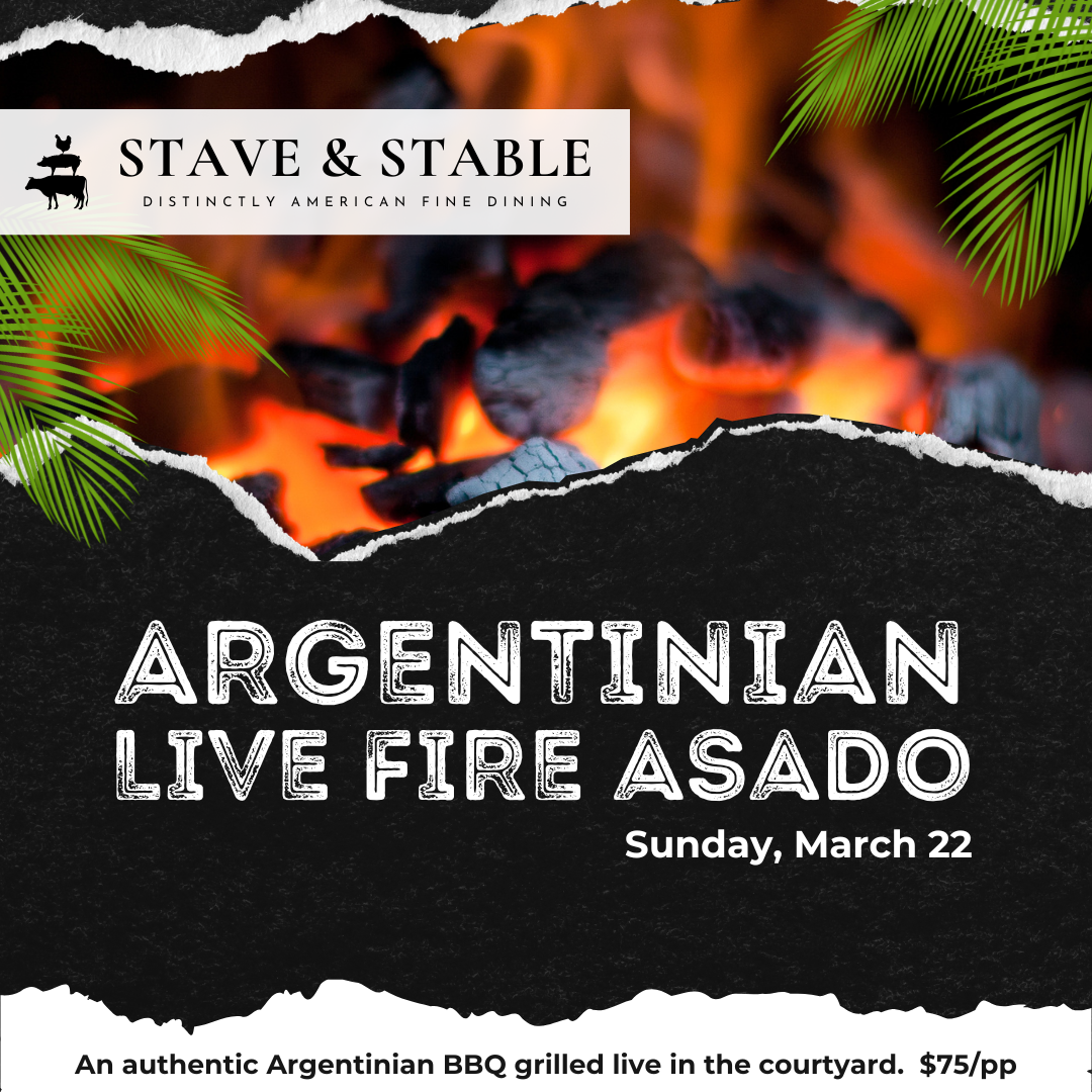 An authentic Argentinian BBQ grilled live in the courtyard. For our March event, seating is indoors, live fire being cooked outside. $75/pp